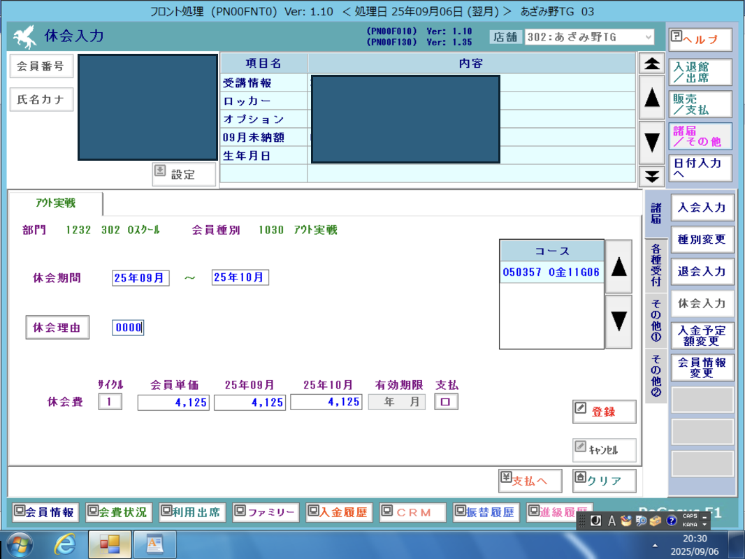 - 画面下に休会日が表示されているか確認(表示されない場合はサイクルを『1』にして登録→その後休会費を確認)